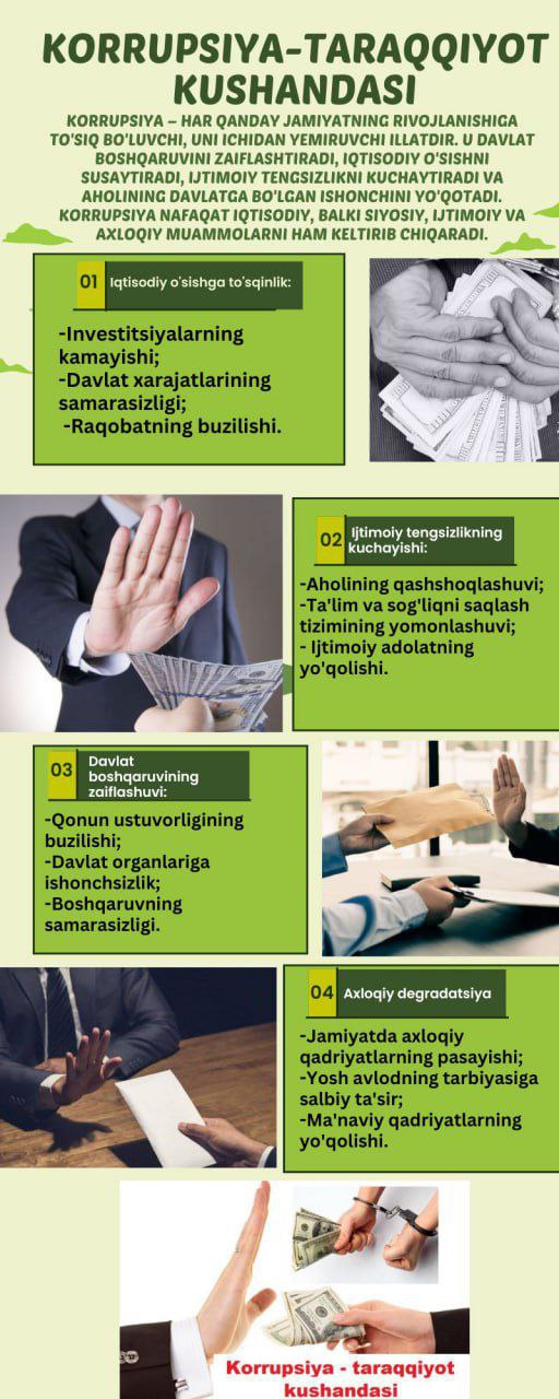 «Korrupsiya taraqqiyot kushandasi.» Sanepidqoʻm Qarshi tumani boʻlimi Axborot xizmati https://t.me/sanepidqom_qarshitum