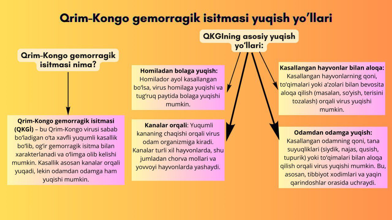 #infografika Qrim-kongo gemorragik isitmasi va uning yuqish yoʻllari haqida yuqoridagi infografika orqali ma’lumotga ega boʻlishingiz mumkin. https://t.me/sanepidqom_qarshitum