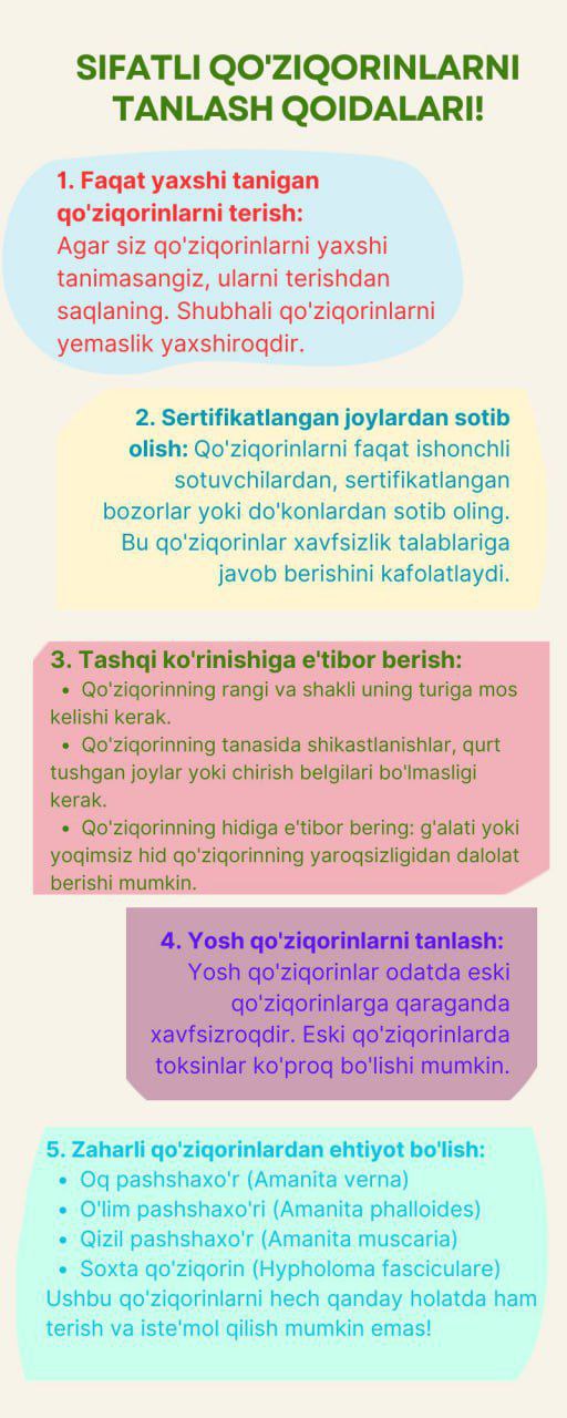 Infografika.. Qoʻziqorindan zaharlanmaslik uchun:sifatli qoʻziqorinlarni qanday tanlash lozim? Yuqoridagi infografika orqali maʼlumotga ega boʻlishingiz mumkin https://t.me/sanepidqom_qarshitum