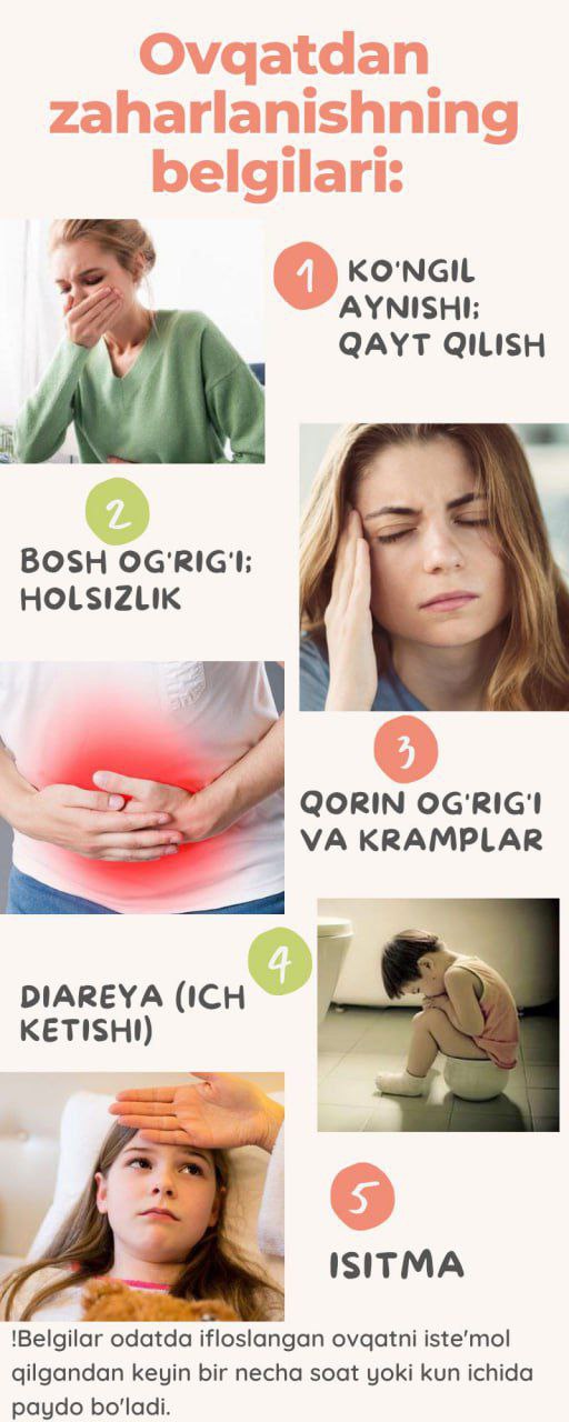 ❗️Ovqatdan zaharlanishdan saqlaning! 📌Ovqatdan zaharlanish — bu ifloslangan yoki buzilgan oziq-ovqatni iste’mol qilish natijasida kelib chiqadigan kasallik. 📌Oziq-ovqatning ifloslanishi quyidagi holatlarda sodir bo’lishi mumkin: ✅Noto’g’ri saqlash va pishirish; ✅Yaroqlilik muddati o’tgan mahsulotlarni iste’mol qilish; ✅Gigiyena qoidalariga rioya qilmaslik; ✅Ifloslangan suvdan…