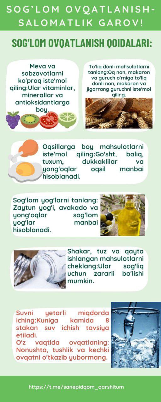#infografika «Sogʻlom ovqatlanish-salomatlik garovi» Sanepidqoʻmita Qarshi tumani boʻlimi Axborot xizmati https://t.me/sanepidqom_qarshitum