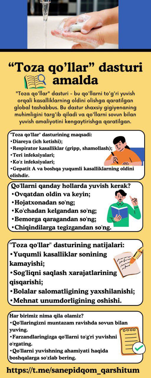 #infografika «Toza qoʻllar» dasturi amalda Sanepidqoʻmita Qarshi tuman boʻlimi Axborot xizmati https://t.me/sanepidqom_qarshitum