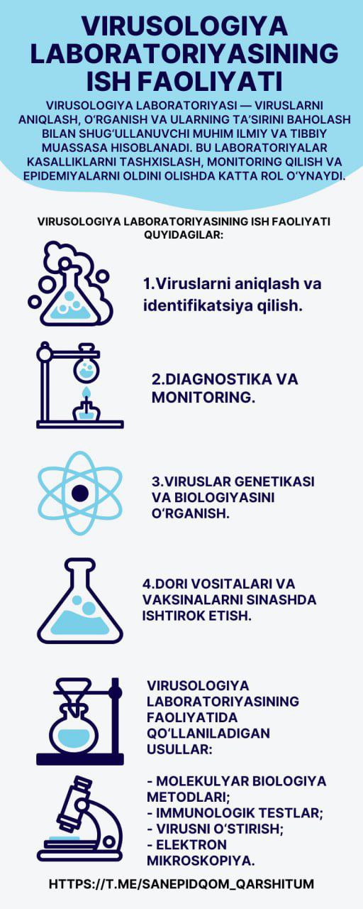 #infografika «Virusologiya laboratoriyasining ish faoliyati» Sanepidqoʻmita Qarshi tuman boʻlimi Axborot xizmati https://t.me/sanepidqom_qarshitum