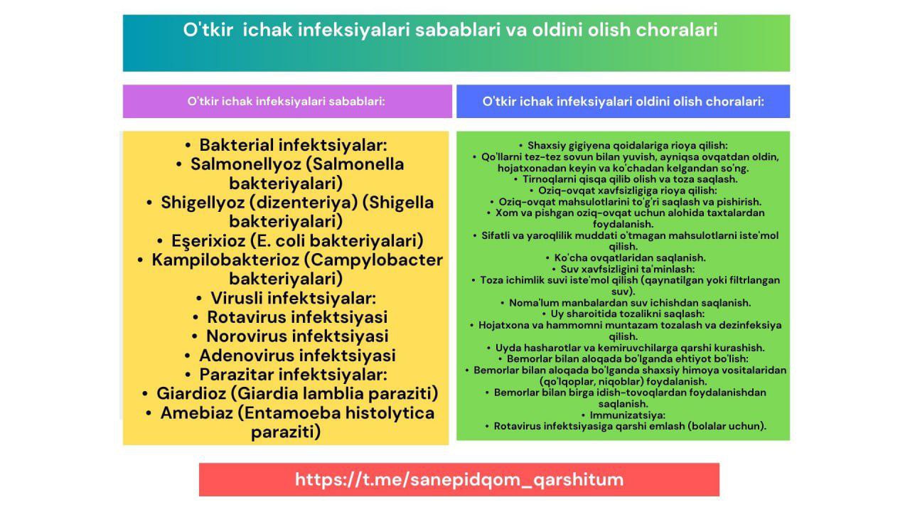 #infografika «Oʻtkir ichak infeksiyalari sabablari va oldini olish choralari» Sanepidqoʻmita Qarshi tuman boʻlimi Axborot xizmati https://t.me/sanepidqom_qarshitum