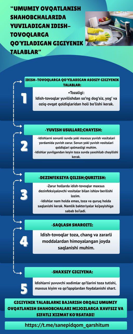 #infografika Umumiy ovqatlanish shahobchalarida yuviladigan idish-tovoqlarga qoʻyiladigan gigiyenik talablar. Sanepidqoʻmita Qarshi tuman boʻlimi Axborot xizmati https://t.me/sanepidqom_qarshitum