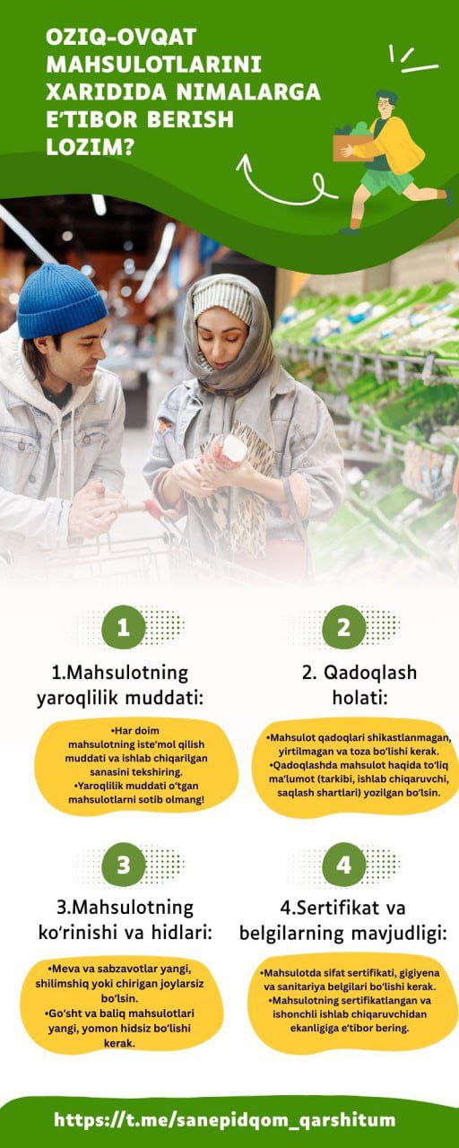 #infografika «Oziq-ovqat mahsulotlarini xaridida nimalarga eʼtibor berish lozim?» Sanepidqoʻmita Qarshi tuman boʻlimi Axborot xizmati https://t.me/sanepidqom_qarshitum