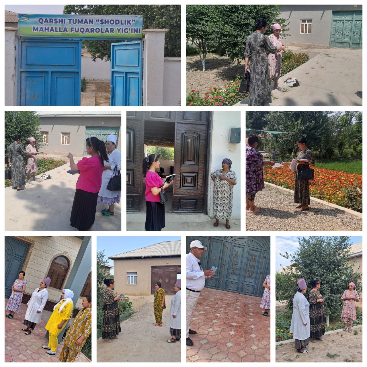 Sanepidqoʻmita Qarshi tuman boʻlimi xodimlari tomonidan Shodlik MFY aholisi oʻrtasida Mahallabay tizimida ishlar olib borildi. Bunda aholi oʻrtasida: ✔️Jismoniy faollikni kun tartibiga qoʻshish; ✔️Toʻgʻri ovqatlanish; ✔️Quturish; ✔️Kuydirgi; ✔️Oʻtkir yuqumli ichak kasalliklari; ✔️Virusli gepatitlar; ✔️Gijja kasalliklari; ✔️Botulizm va turli koʻrinishdagi ovqatdan…
