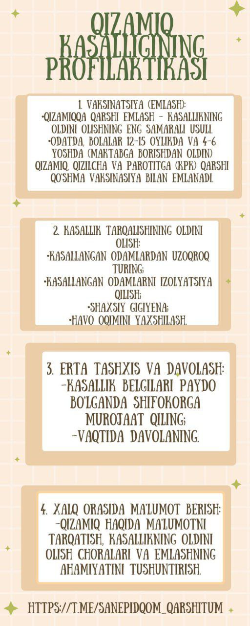 #infografika «Qizamiq kasalligining profilaktikasi» «Sanepidqoʻmita Qarshi tuman boʻlimi Axborot xizmati https://t.me/sanepidqom_qarshitum