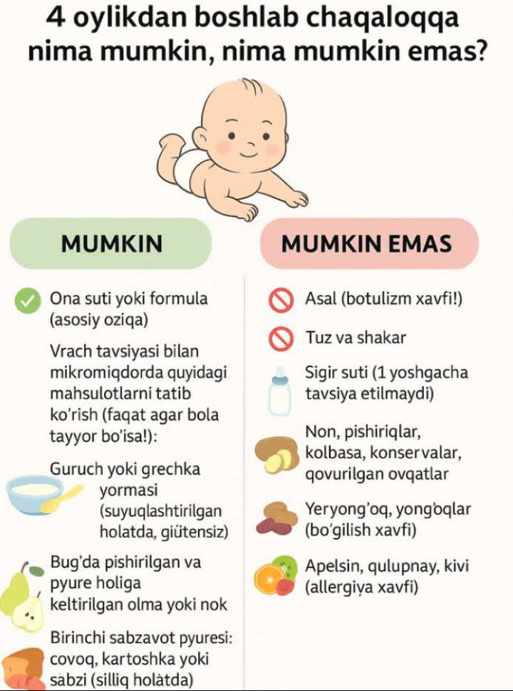 #infografika «4 oylikdan boshlab chaqaloqqa nima mumkin,nima mumkin emas?» Sanepidqoʻmita Qarshi tuman boʻlimi Axborot xizmati https://t.me/sanepidqom_qarshitum
