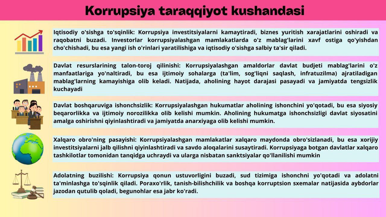 #infografika Korrupsiya — jamiyatning barcha sohalariga zarar yetkazuvchi, taraqqiyotga to’siq bo’luvchi eng katta illatlardan biridir. U iqtisodiy o’sishni sekinlashtiradi, ijtimoiy adolatni buzadi, davlat boshqaruviga ishonchni yo’qotadi va xalqaro maydonda mamlakat obro’siga putur yetkazadi. Korrupsiyaga qarshi kurash – bu har bir…
