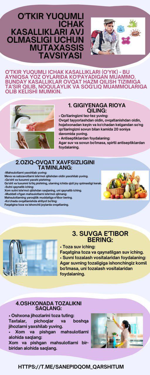 #infografika «Oʻtkir yuqumli ichak kasalliklari avj olmasligi uchun mutaxassis tavsiyasi» Sanepidqoʻmita Qarshi tuman boʻlimi Axborot xizmati https://t.me/sanepidqom_qarshitum