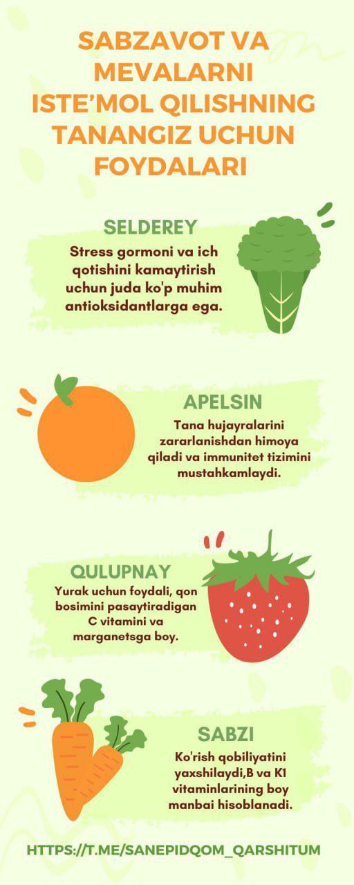 #infografika «Sabzavot va mevalarni isteʼmol qilishning tanangiz uchun foydalari» Sanepidqoʻmita Qarshi tuman boʻlimi Axborot xizmati https://t.me/sanepidqom_qarshitum