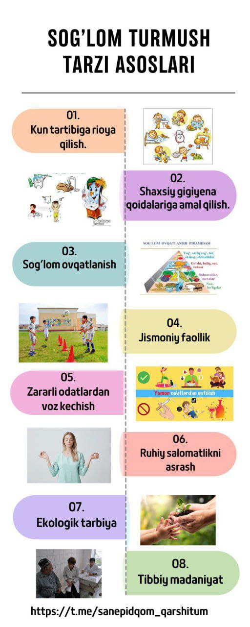 #infografika «Sogʻlom turmush tarzi asoslari» Sanepidqoʻmita Qarshi tuman boʻlimi Axborot xizmati https://t.me/sanepidqom_qarshitum