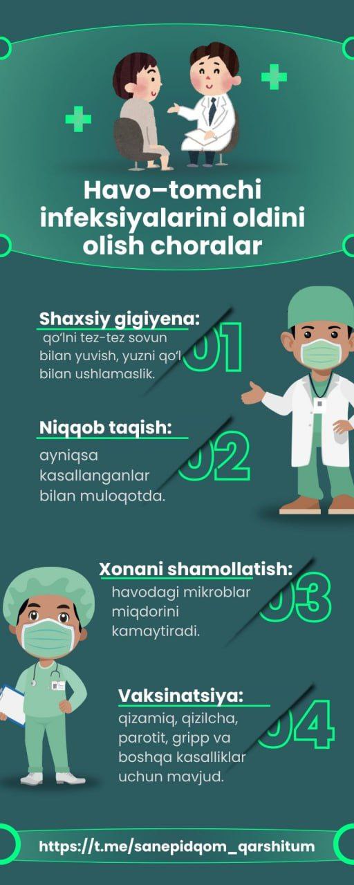 #infografika » » Havo-tomchi infeksiyalarini oldini olish choralari » «Sanepidqoʻmita Qarshi tuman boʻlimi Axborot xizmati https://t.me/sanepidqom_qarshitum