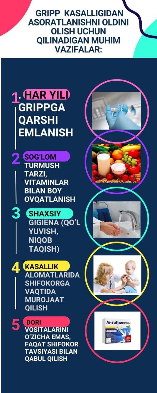 #infografika «Gripp kasalligidan asoratlanishni oldini olish uchun qilinadigan vazifalar «Sanepidqoʻmita Qarshi tuman boʻlimi Axborot xizmati https://t.me/sanepidqom_qarshitum