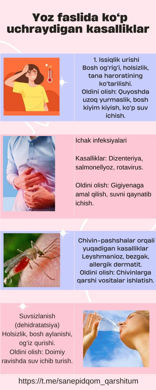 #infografika «Yoz faslida ko’p uchraydigan kasalliklar » «Sanepidqoʻmita Qarshi tuman boʻlimi Axborot xizmati https://t.me/sanepidqom_qarshitum