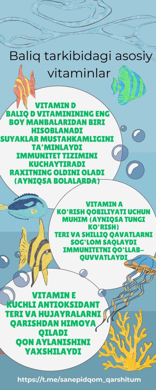 #infografika » Baliq tarkibidagi asosiy vitaminlar » «Sanepidqoʻmita Qarshi tuman boʻlimi Axborot xizmati https://t.me/sanepidqom_qarshitum