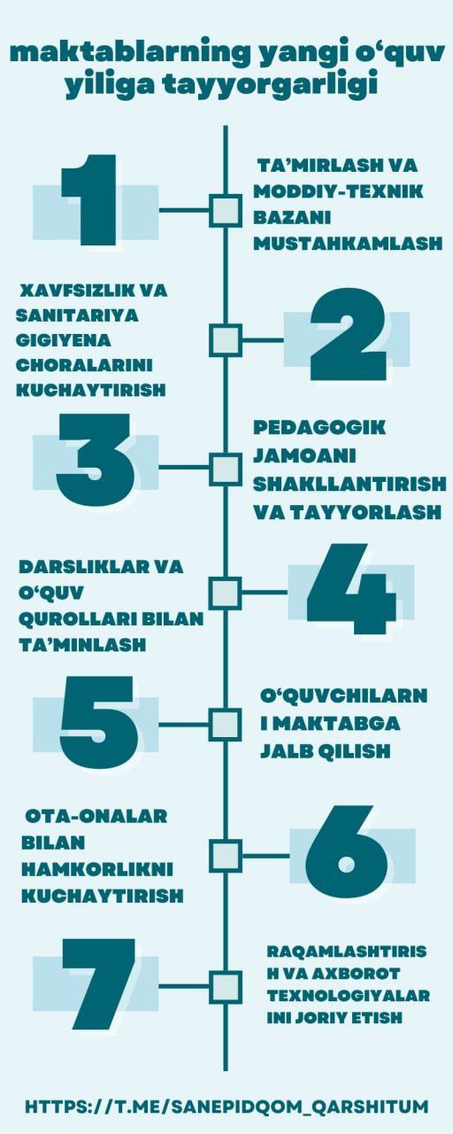 #infografika «Maktablarni yangi o’quv yiliga tayyorgarligi» «Sanepidqoʻmita Qarshi tuman boʻlimi Axborot xizmati https://t.me/sanepidqom_qarshitum