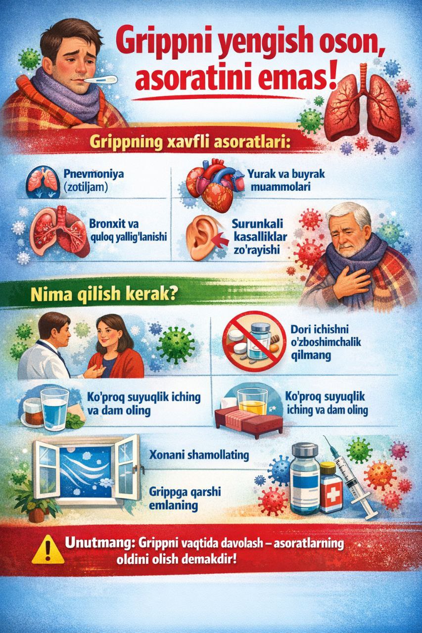 #infografika «Grippni yengish oson, asoratini emas» «Sanepidqoʻmita Qarshi tuman boʻlimi Axborot xizmati https://t.me/sanepidqom_qarshitum