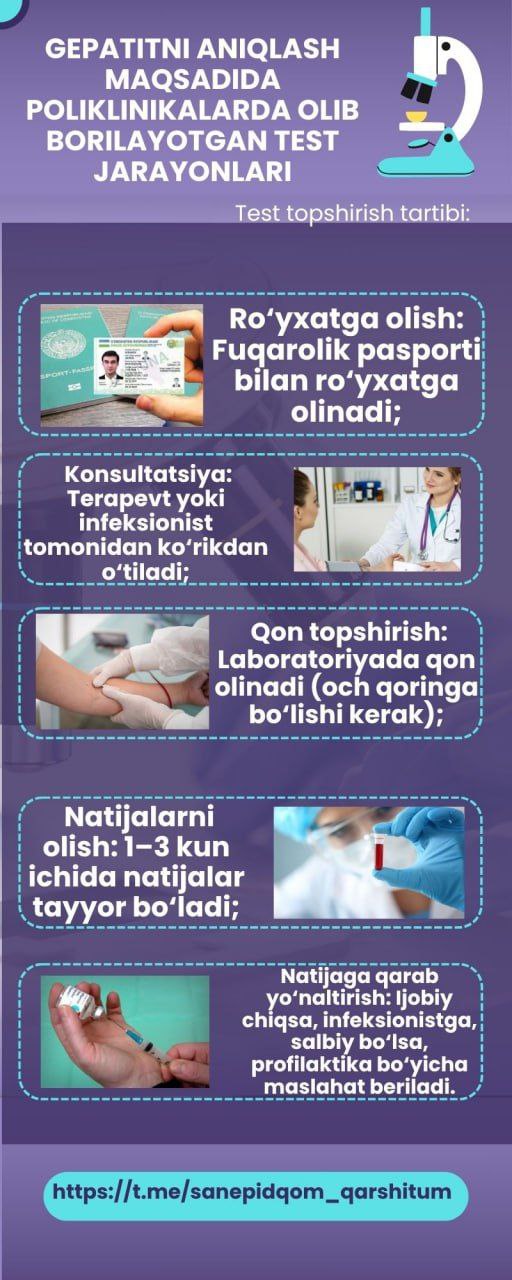 #infografika «Gepatitni aniqlash bo’yicha olib borilayotgan test jarayonlari» «Sanepidqoʻmita Qarshi tuman boʻlimi Axborot xizmati https://t.me/sanepidqom_qarshitum
