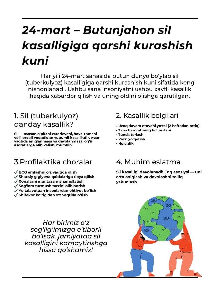 #infografika «24-mart Butun jahon sil kasalligiga qarshi kurashish kuni» «Sanepidqoʻmita Qarshi tuman boʻlimi Axborot xizmati https://t.me/sanepidqom_qarshitum