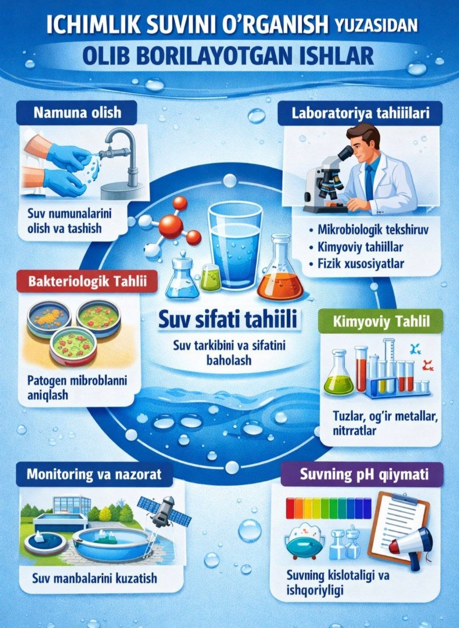 #infografika «Ichimlik suvini oʻrganish yuzasidan olib borilayotgan ishlar» Sanepidqoʻmita qarshi tuman boʻlimi Axborot xizmati https://t.me/sanepidqom_qarshitum