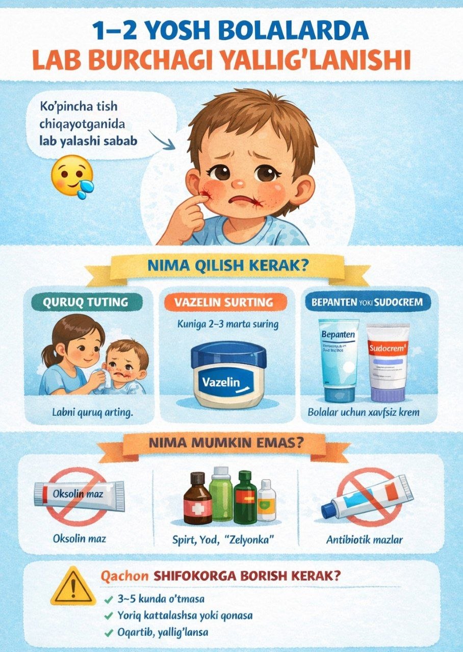 #infografika «1-2 yosh bolalarda lab burchagi yalligʻlanishi» Sanepidqoʻmita Qarshi tuman boʻlimi Axborot xizmati https://t.me/sanepidqom_qarshitum