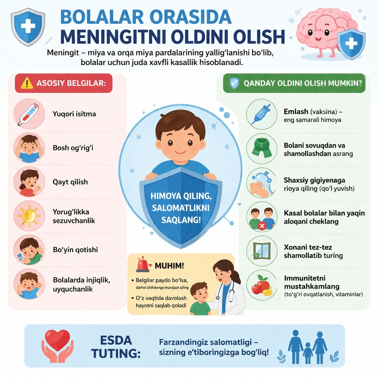 🧠 Bolalar orasida meningitni oldini olish 🧠Meningit — miya va orqa miya pardalarining yallig‘lanishi bo‘lib, bolalar uchun juda xavfli kasallik hisoblanadi. ⚠️ Asosiy belgilar: Yuqori isitma; Bosh og‘rig‘i; Qayt qilish; Yorug‘likka sezuvchanlik; Bo‘yin qotishi; Bolalarda injiqlik, uyquchanlik. Qanday oldini olish…