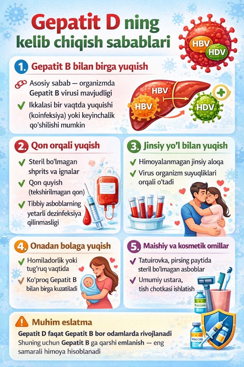 #infografika «Gepatit Dning kelib chiqish sabablari» Sanepidqoʻmita qarshi tuman boʻlimi Axborot xizmati
