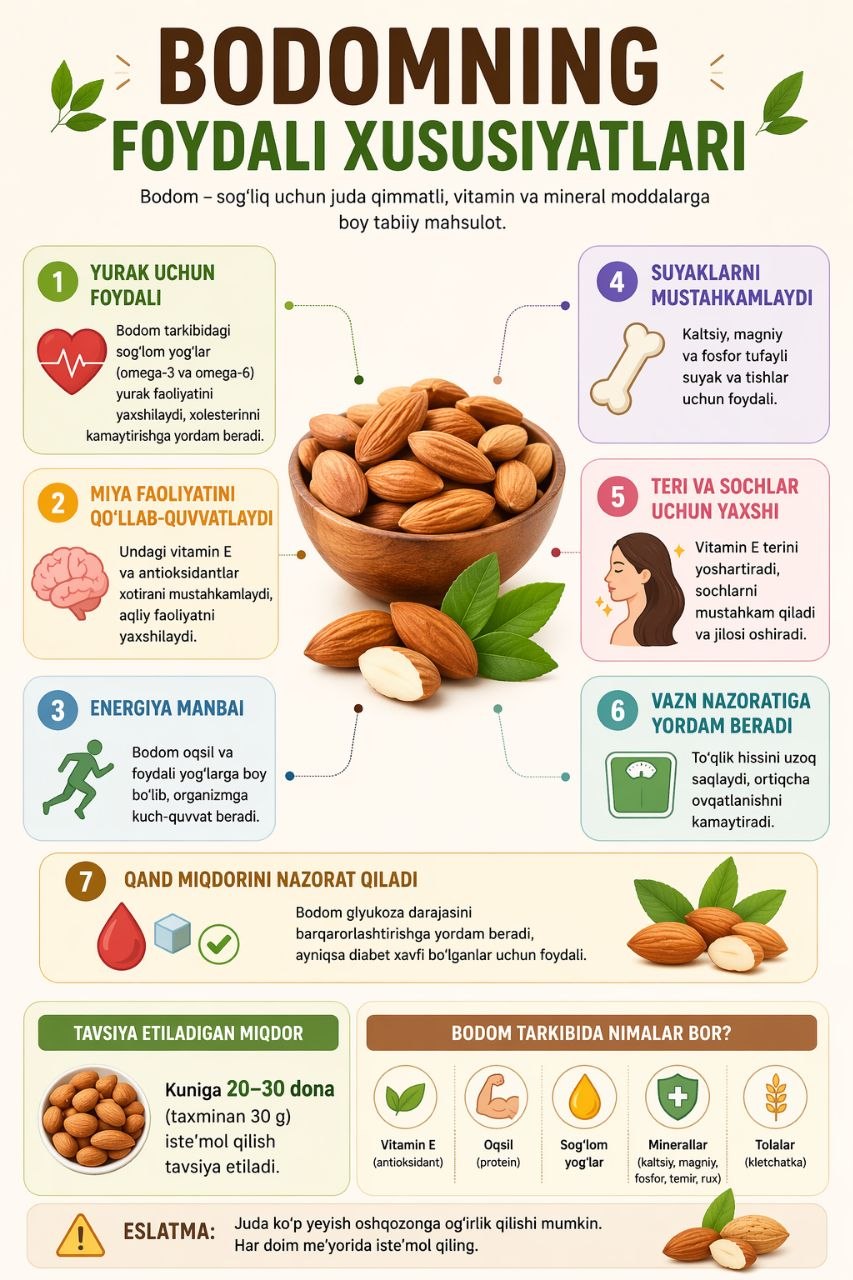 #infografika «Bodomning foydali xususiyatlari» Sanepidqoʻmita qarshi tuman boʻlimi Axborot xizmati https://t.me/sanepidqom_qarshitum