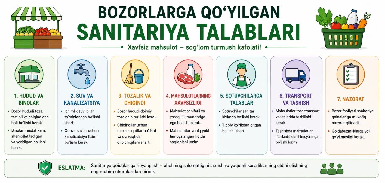 #infografika «Bozorlarga qanday sanitariya talablari qoʻyilgan?» Sanepidqoʻmita qarshi tuman boʻlimi Axborot xizmati https://t.me/sanepidqom_qarshitum