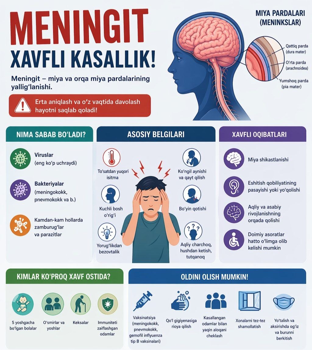 #infografika «Meningit xavfli kasallik» Sanepidqoʻmita qarshi tuman boʻlimi Axborot xizmati https://t.me/sanepidqom_qarshitum