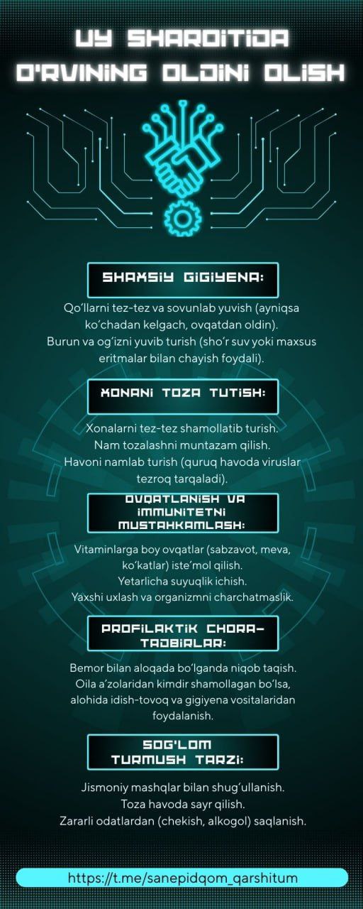 #infografika » » Uy sharoitida O’RVIning oldini olish » «Sanepidqoʻmita Qarshi tuman boʻlimi Axborot xizmati https://t.me/sanepidqom_qarshitum