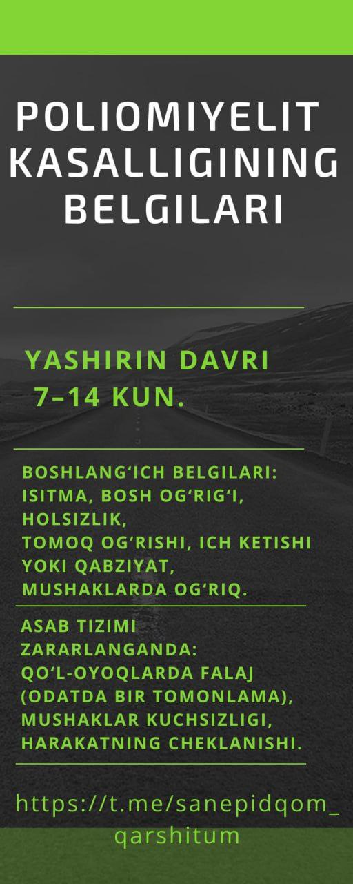 #infografika » » Poliomiyelit kasalligining belgilar» «Sanepidqoʻmita Qarshi tuman boʻlimi Axborot xizmati https://t.me/sanepidqom_qarshitum