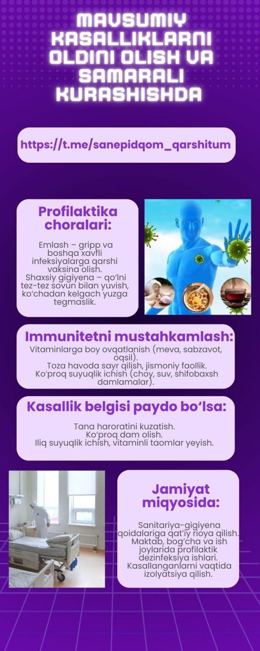#infografika » » Mavsumiy kasalliklarga qarshi qanday kurashish kerak » «Sanepidqoʻmita Qarshi tuman boʻlimi Axborot xizmati https://t.me/sanepidqom_qarshitum