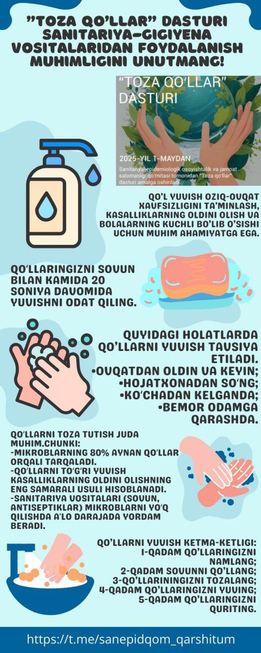 «Toza qoʻllar» dasturi sanitariya-gigiyena vositalaridan foydalanish muhimligini unutmang!